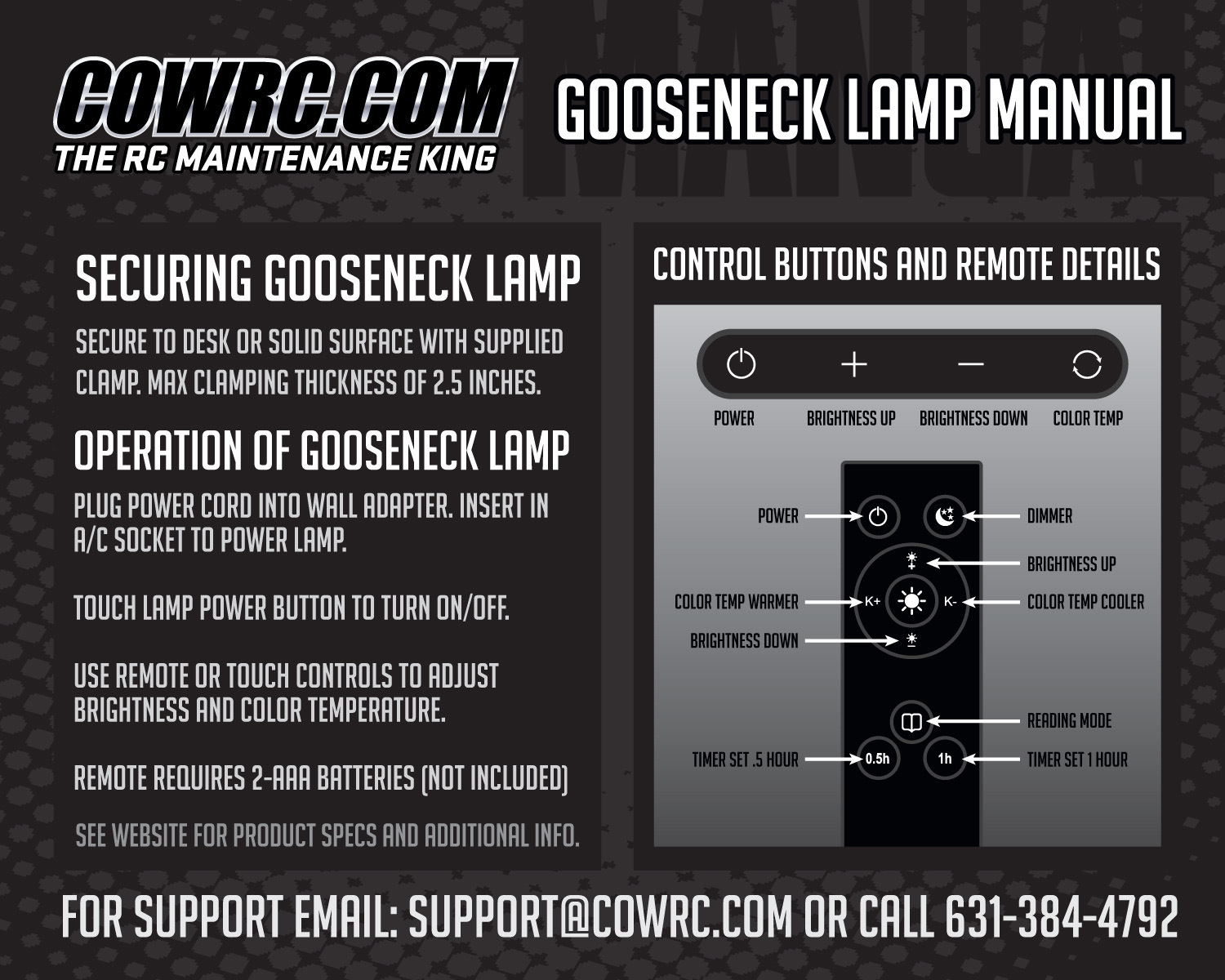 We imported this RC friendly & value packed desk lamp that picks up where other more expensive options fall short. Easy to set up. Aluminum alloy & ABS Ultra wide 32" soft & super bright LED wand. Sturdy 360 degree flexible metal gooseneck/silicone mount. 4 touch control switches and convenient remote. Stepless dimming & temperature control. Featuring everything you hope for in units costing far more and offering much less! All this at an extremely reasonable price, WOW!