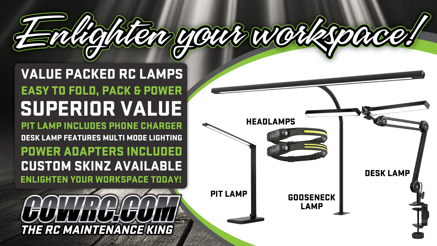 Quick view Details FreqEsKinz | sku: CPP-V81012535 Folding Pit Lamp sKinz MSRP: Now: $8.99 Choose Options Compare SALE Quick view Imports | sku: CPR-A54023625 Gooseneck Desk Lamp W/Remote Gooseneck Desk Lamp W/Remote: We imported this RC friendly & value packed desk lamp that picks up where other more expensive options fall short. Easy to set up. Aluminum alloy & ABS Ultra wide 32" soft & super bright LED wand. Sturdy 360... MSRP: $59.99 Was: $59.99 Now: $44.99 Pre-Order Now Compare SALE Quick view Imports | sku: CPR-A54013623 Folding Pit Lamp (New & Improved!) Foldable Pit Lamp: New and improved 2026 Model with 25% More Wattage, 50% More USB Output Power, & USBc compatibility in the exact same casing and form factor everyone loved... Previous version 8W / Now 10W! Previous version 5w USB out / Now 10w USB... MSRP: $39.99 Was: $39.99 Now: $31.99 Pre-Order Now Compare SALE Quick view Imports | sku: CPR-A54013332 Folding Desk Lamp Foldable Desk Lamp: We imported this RC friendly & value packed desk lamp that picks up where other more expensive options fall short. Easy to fold, pack, travel, and power. Featuring everything you hope for in units costing far more and offering... MSRP: $39.99 Was: $39.99 Now: $31.99 Pre-Order Now Compare Quick view Imports | sku: CPR-A54013533 Folding Pit Lamp Foldable Pit Lamp: We imported this RC friendly & value packed desk lamp that picks up where other more expensive options fall short. Easy to fold, pack, travel, and power. Featuring everything you hope for in units costing far more and offering much... MSRP: $32.99 Now: $29.99 Choose Options Compare Quick view Imports | sku: CPR-A25313544 Dual Band Rechargeable Head Lamp Dual Rechargeable Head Lamp: Our RC friendly & value packed head lamp picks up where other more expensive options fall short. Lightweight, comfortable, and very powerful for it's price point. Featuring everything you hope for in units costing far... MSRP: Now: $14.99 Add to Cart Compare Quick view FreqEsKinz | sku: CPP-V81012627 Gooseneck Desk Lamp sKinz Add that extra little "MOO" touch with our High Quality Gloss Laminated sKinz. Get Cow-Ordinated with theme matched Pit Mats, Part Trays, Decals, Jet Blasters, Pit Towels, Banners, Apparel, and more! Send us your repping rides & wrench spot pictures... MSRP: Now: $13.99 Choose Options Compare Quick view Imports | sku: CPR-A53013554 Rechargeable Head Lamp Rechargeable Head Lamp: Our RC friendly & value packed head lamp picks up where other more expensive options fall short. Lightweight, comfortable, and very powerful for it's price point. Featuring everything you hope for in units costing far more and... MSRP: Now: $9.99 Add to Cart Compare Quick view FreqEsKinz | sku: CPP-V81012534 Folding Desk Lamp sKinz Add that extra little "MOO" touch with our High Quality Gloss Laminated sKinz. Get Cow-Ordinated with theme matched Pit Mats, Part Trays, Decals, Jet Blasters, Pit Towels, Banners, Apparel, and more! Send us your repping rides & wrench spot pictures... MSRP: Now: $9.99 Choose Options Compare Quick view FreqEsKinz | sku: CPP-V81012535 Folding Pit Lamp sKinz Add that extra little "MOO" touch with our High Quality Gloss Laminated sKinz. Get Cow-Ordinated with theme matched Pit Mats, Part Trays, Decals, Jet Blasters, Pit Towels, Banners, Apparel, and more! Send us your repping rides & wrench spot pictures... MSRP: Now: $8.99 Choose Options Compare Compare Selected × OK