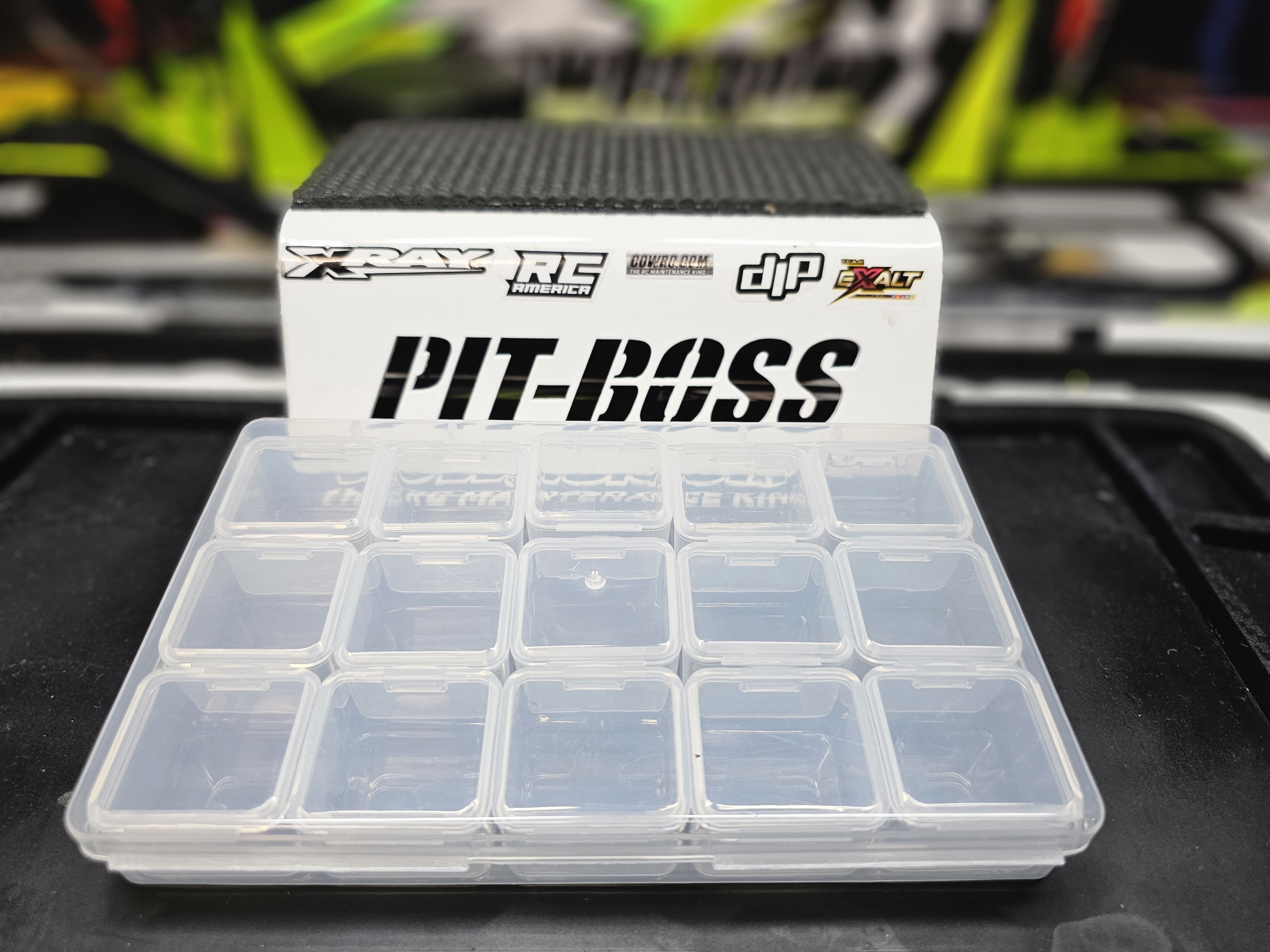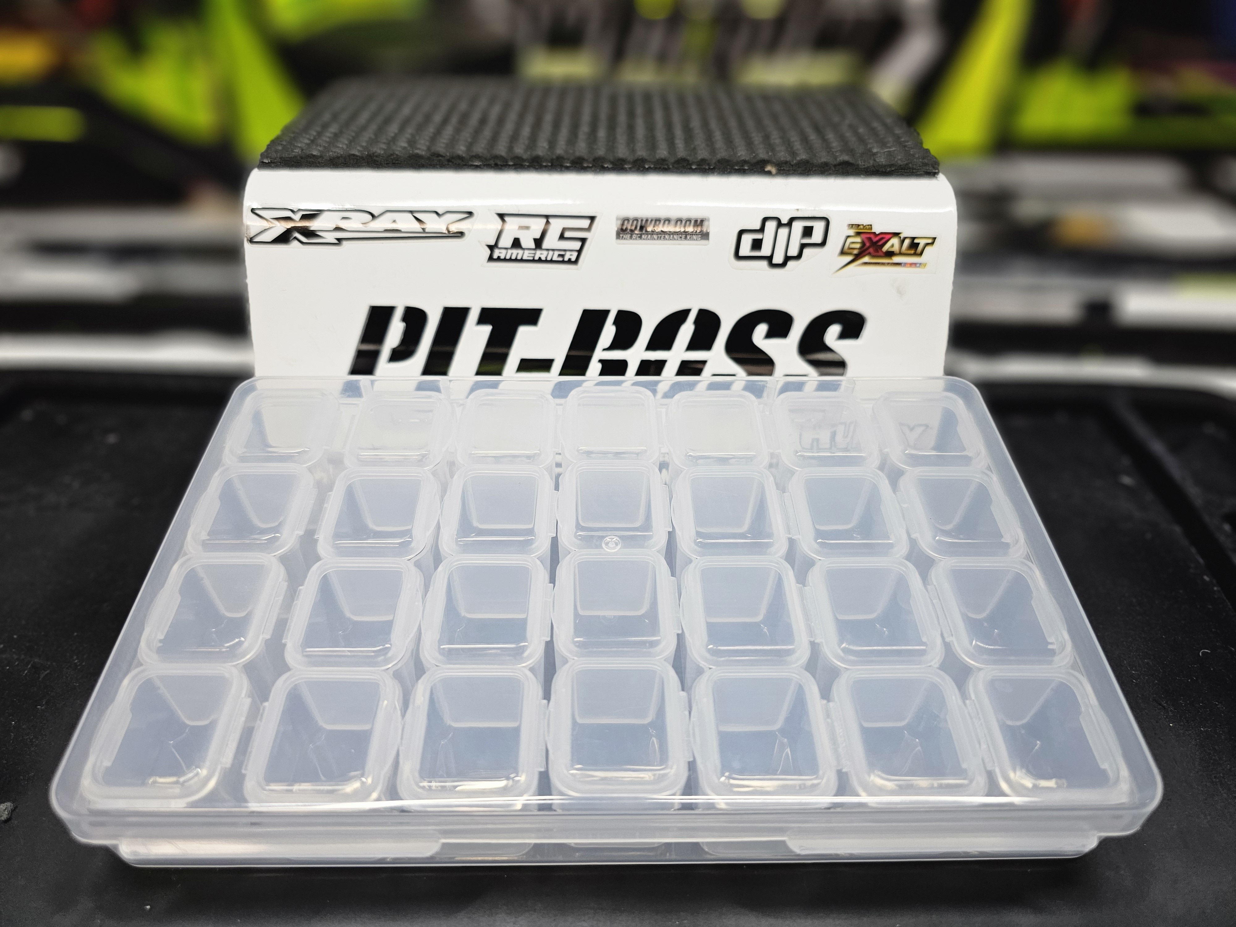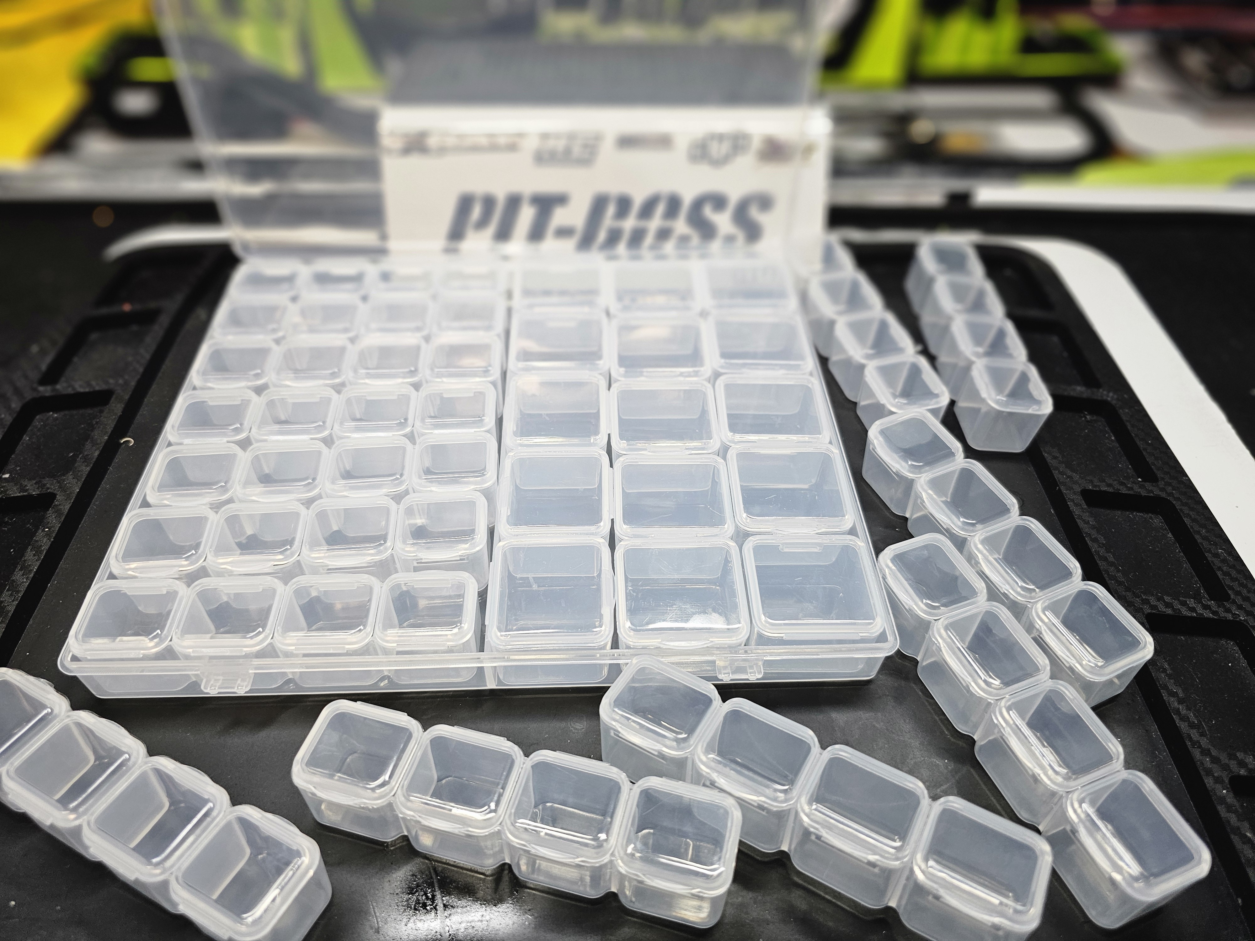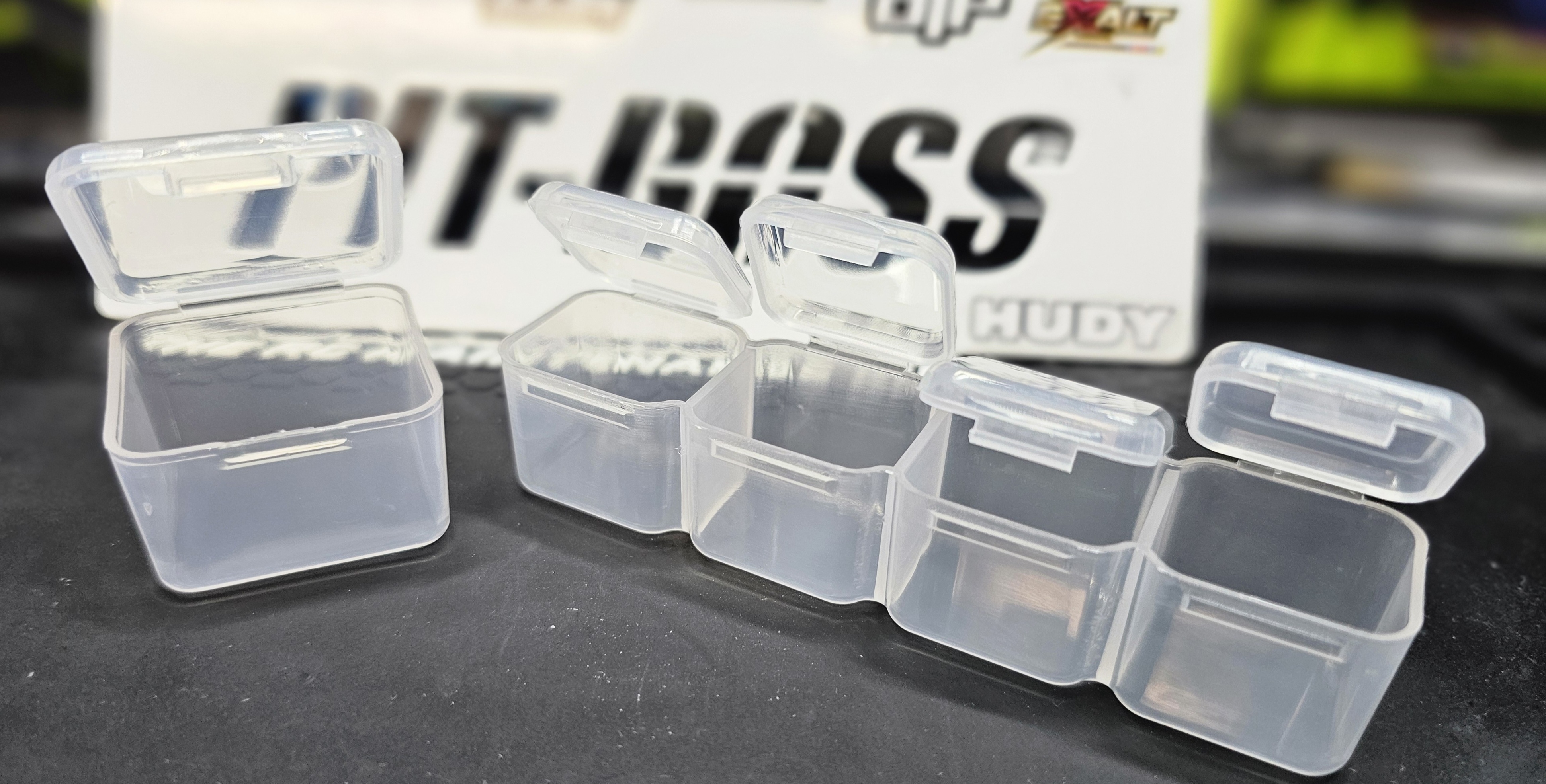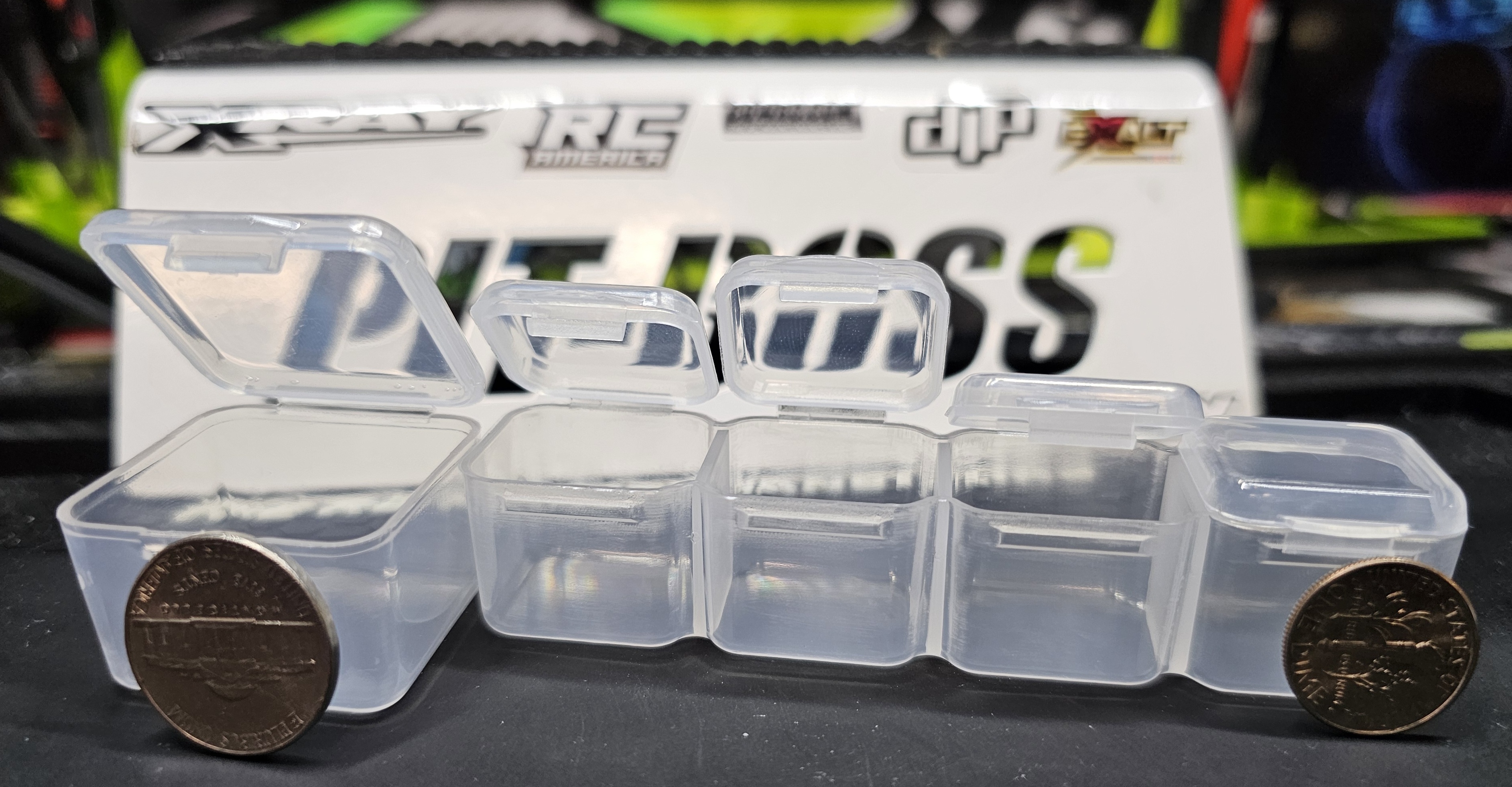 The combo consists of 5 boxes with smaller individual boxes inside allowing you to organize your RC needs. From nuts, bolts, screws, seals, or whatever you desire.