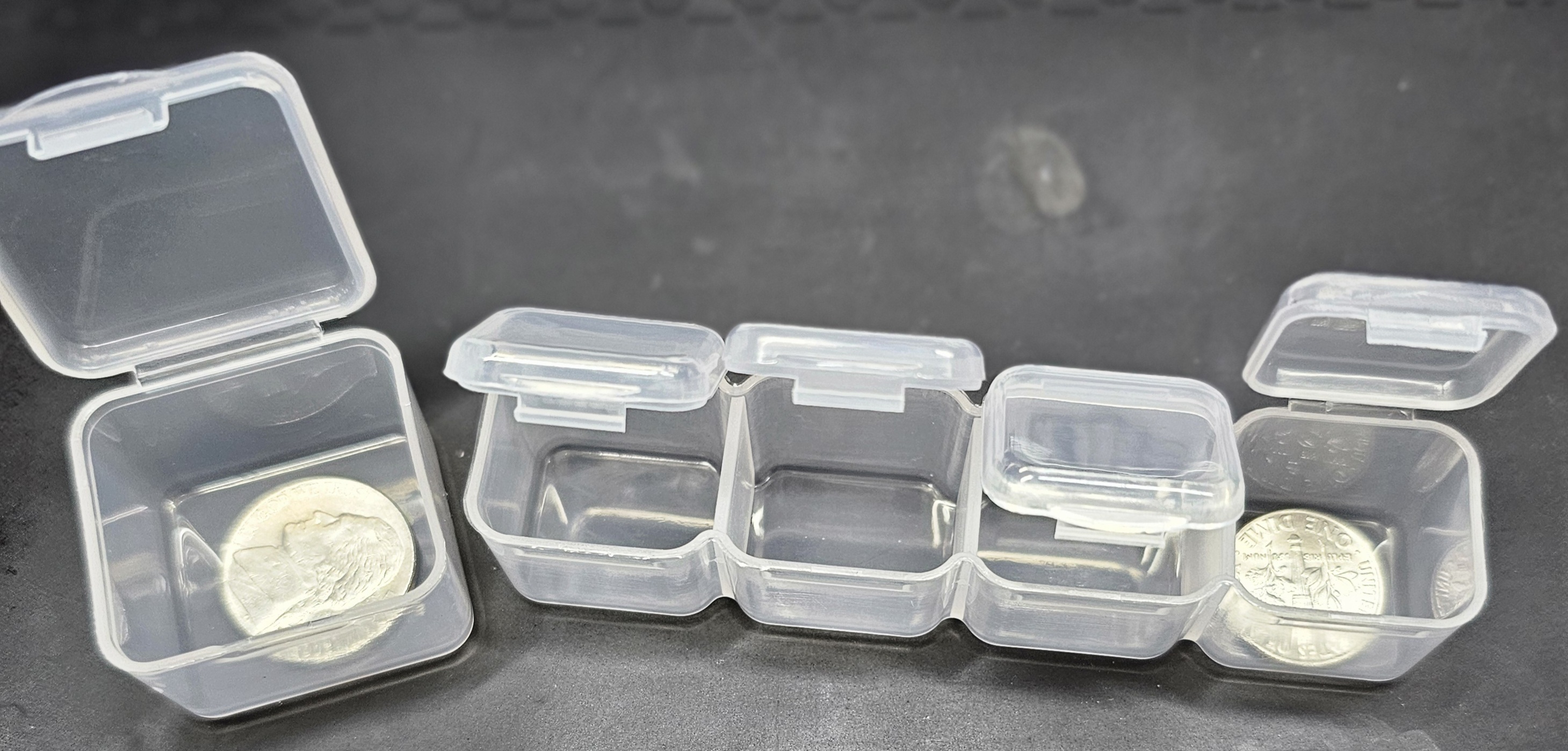 The smaller boxes also have latches to keep them secure. I used a dime and a nickel for a size comparison.